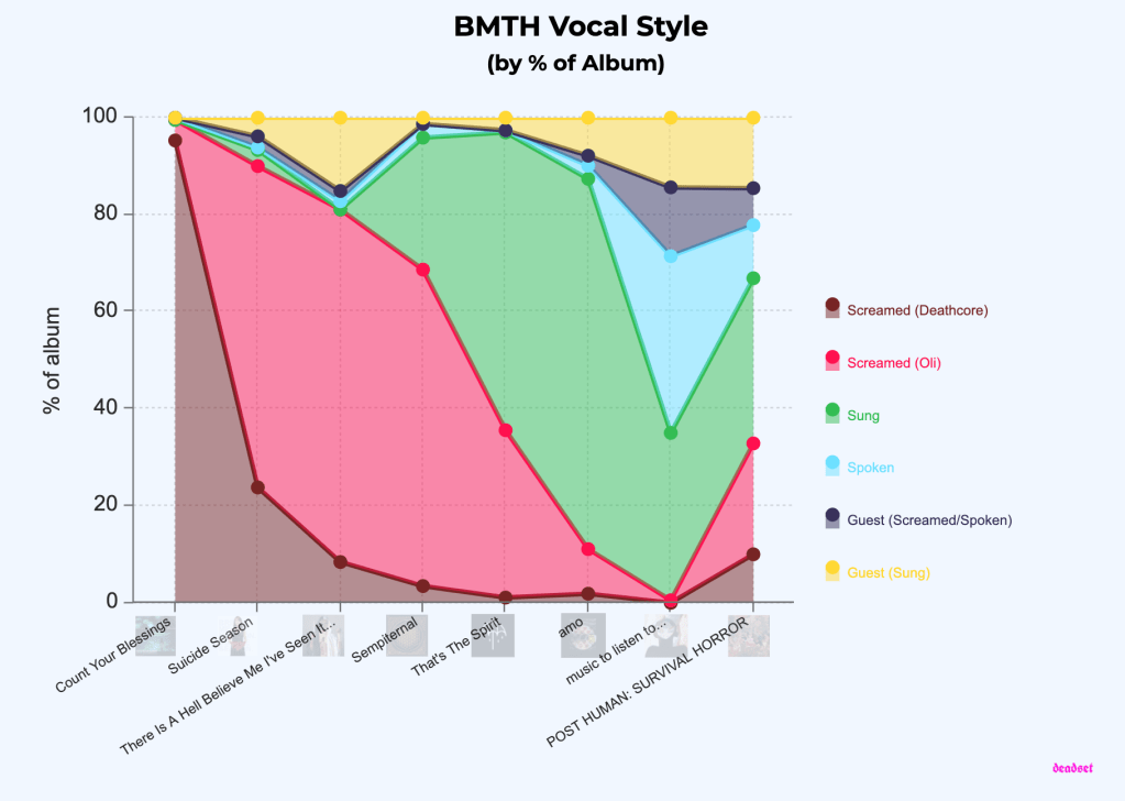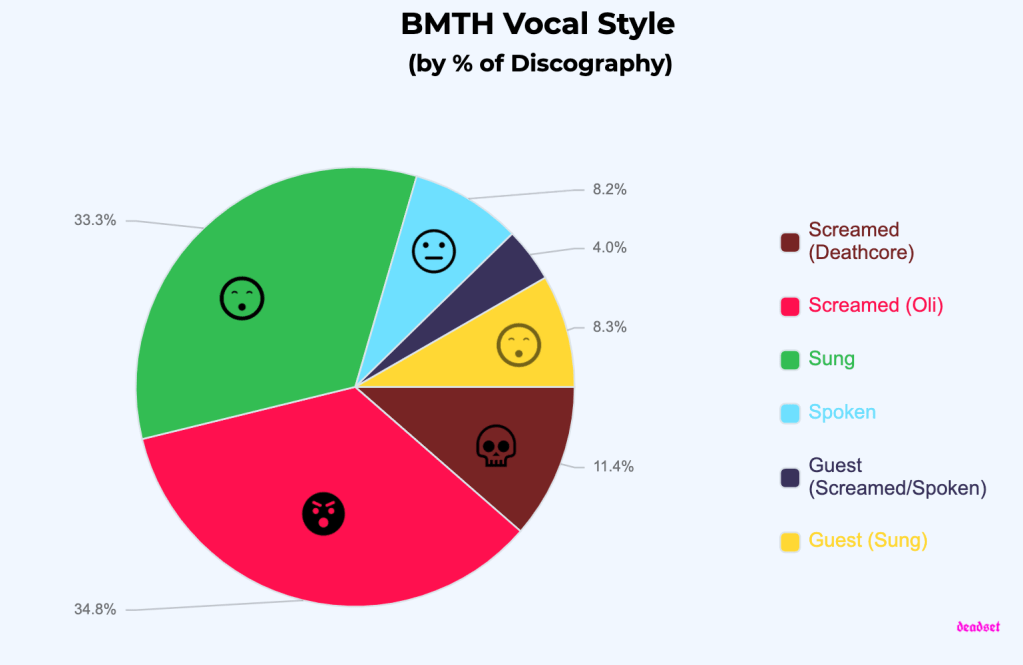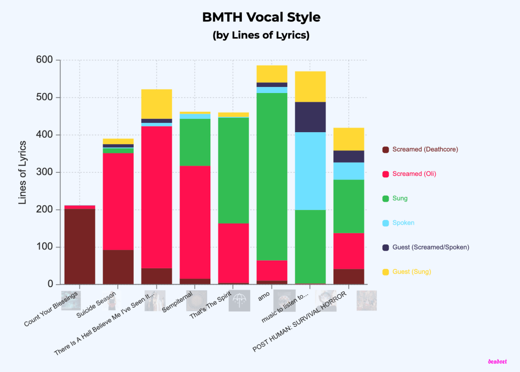 Taking into account every album release, the total breakdown is shown below. There is almost an equal number of lines dedicated to singing by Oli and screaming across BMTH’s discography. Taking into account the heavier style of deathcore screaming, featured prominently on Count Your Blessings (2006) and surprisingly some on POST HUMAN (2010), total screaming makes up almost 50% of all BMTH songs.